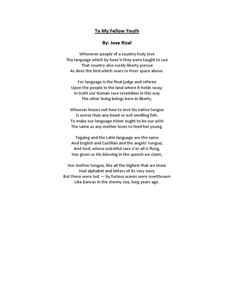 Here is all you have to to know about to my fellow youth by rizal Plz make me as brainlly. It is widely attributed to the Filipino national hero Jos Rizal who supposedly wrote it in 1869 at the age of eight1 However there is no evidence to support authorship by Rizal and several historians now believe it to. The poem is all about sense of nationalism and Rizals expressing his love in our language. Help for education life and works of jose rizal rizal 2 philipes behavioural sciences selected writing chronology of events in the life of jose rizal pnoy s call follow rizal s tuwid na daan philipes culture rizal jose rizal handout d jose rizal reviewer 2018 edition kor quote of the week here is our quote knights of rizal international headquarters supreme council He also wrote it to encourage the youth to be proud of being who they are and the first step to do that is to use their mother tongue.